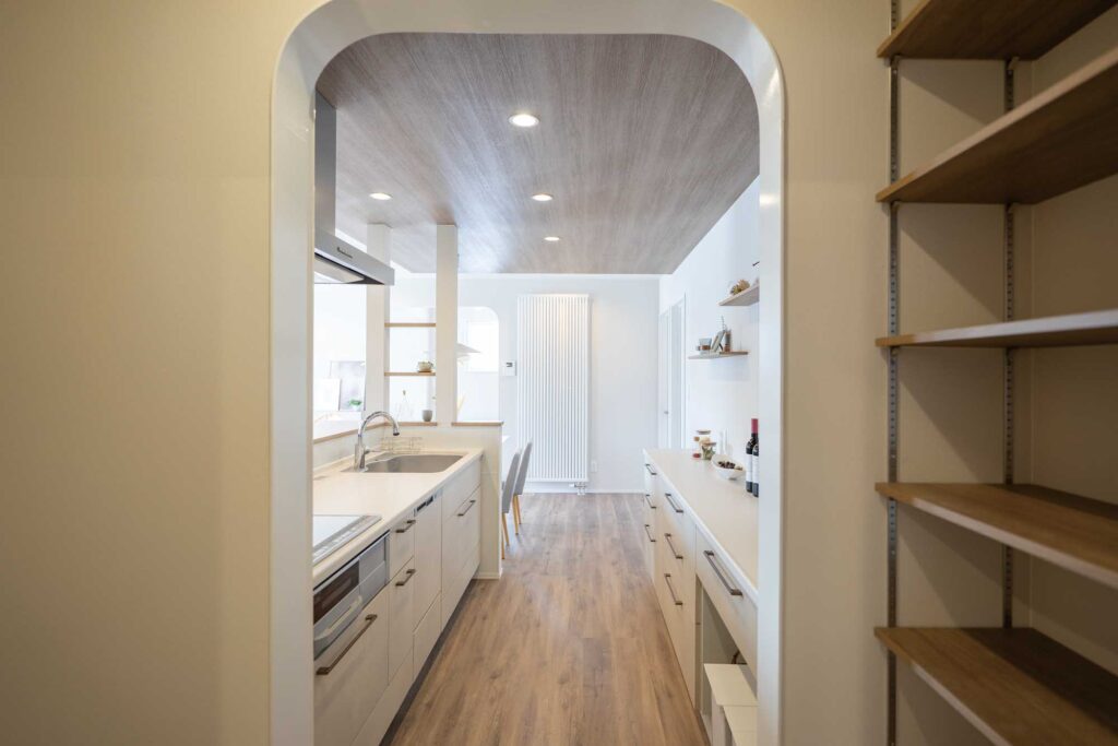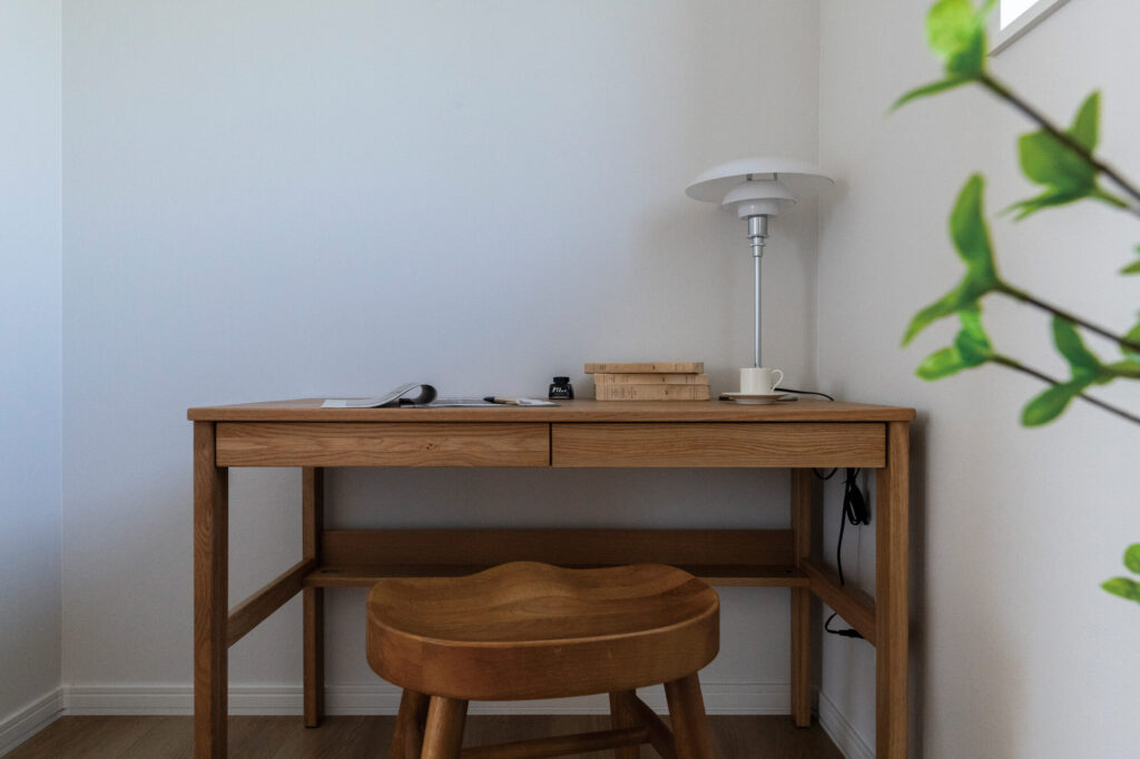 リビングの書斎コーナーで、読書や趣味など自分の時間をゆったり楽しめる平屋!両側通路で動きやすいキッチンやユーティリティー・ファミクロ・寝室がつながる動きやすい動線でなど、毎日の暮らしが自然に整う、ストレスフリーな間取りが見どころです。